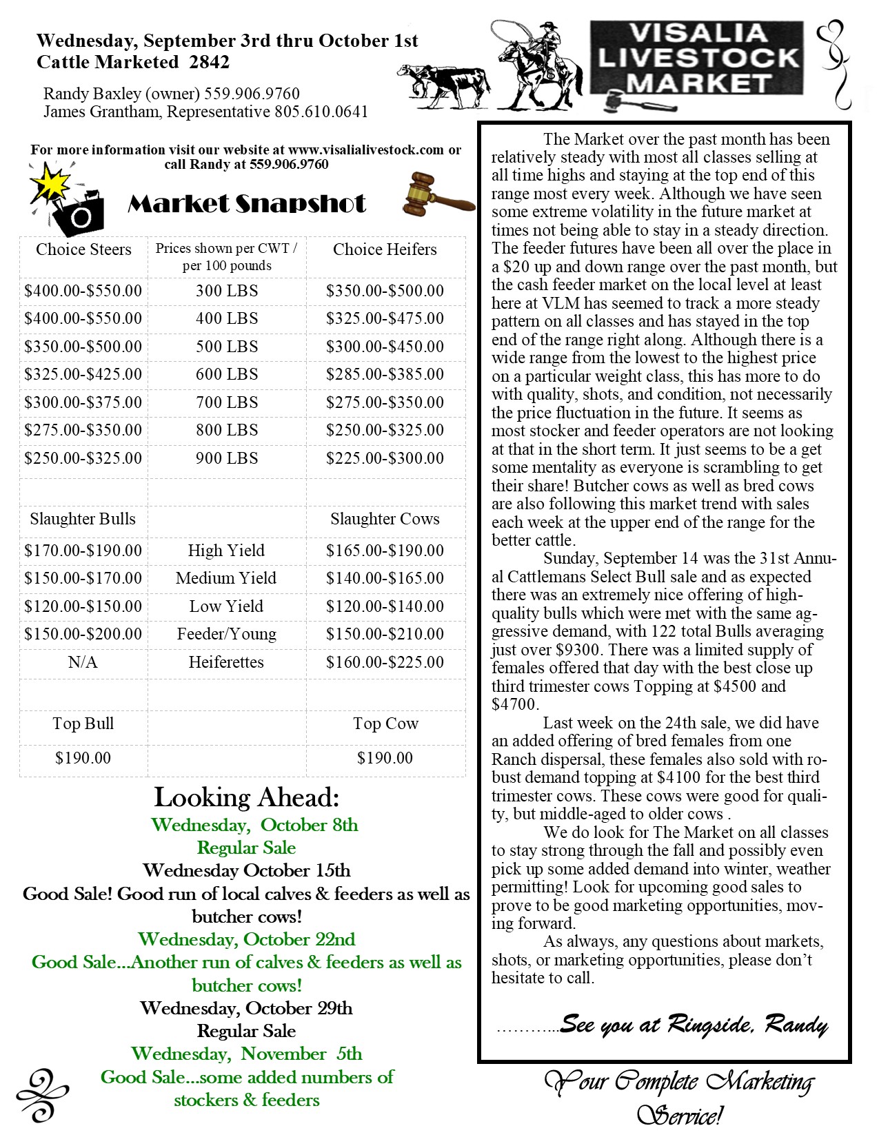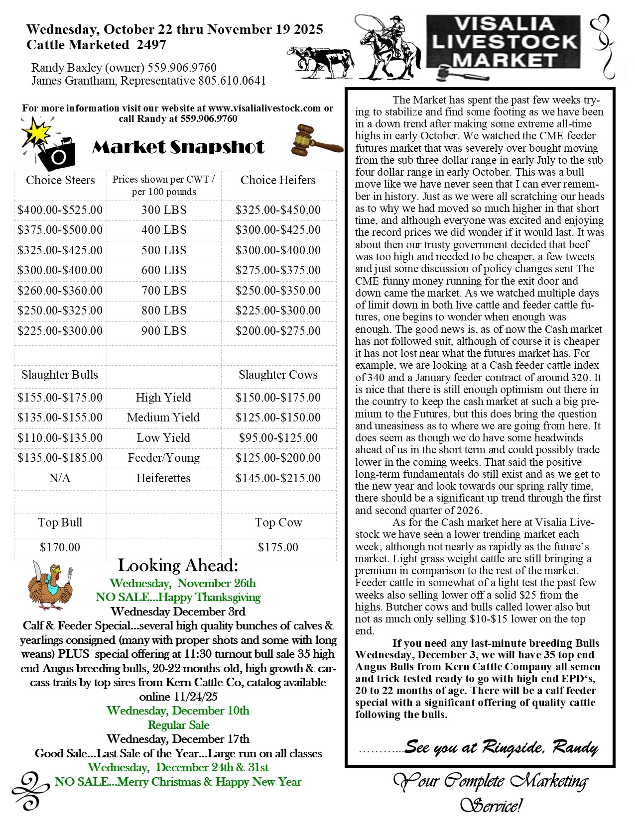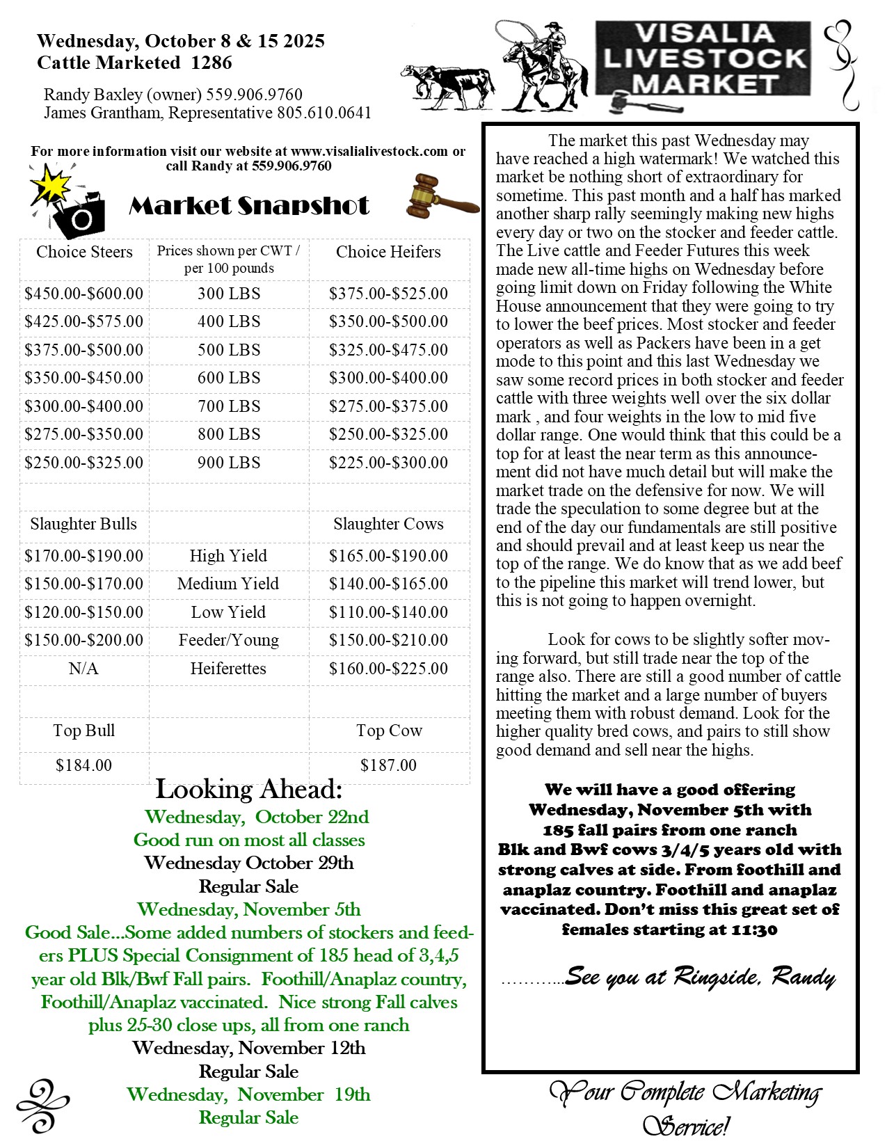 Market Snapshot is a quick look at our latest sale...please check out our last market report for more information on upcoming sales and what is happening at Visalia Livestock Market!